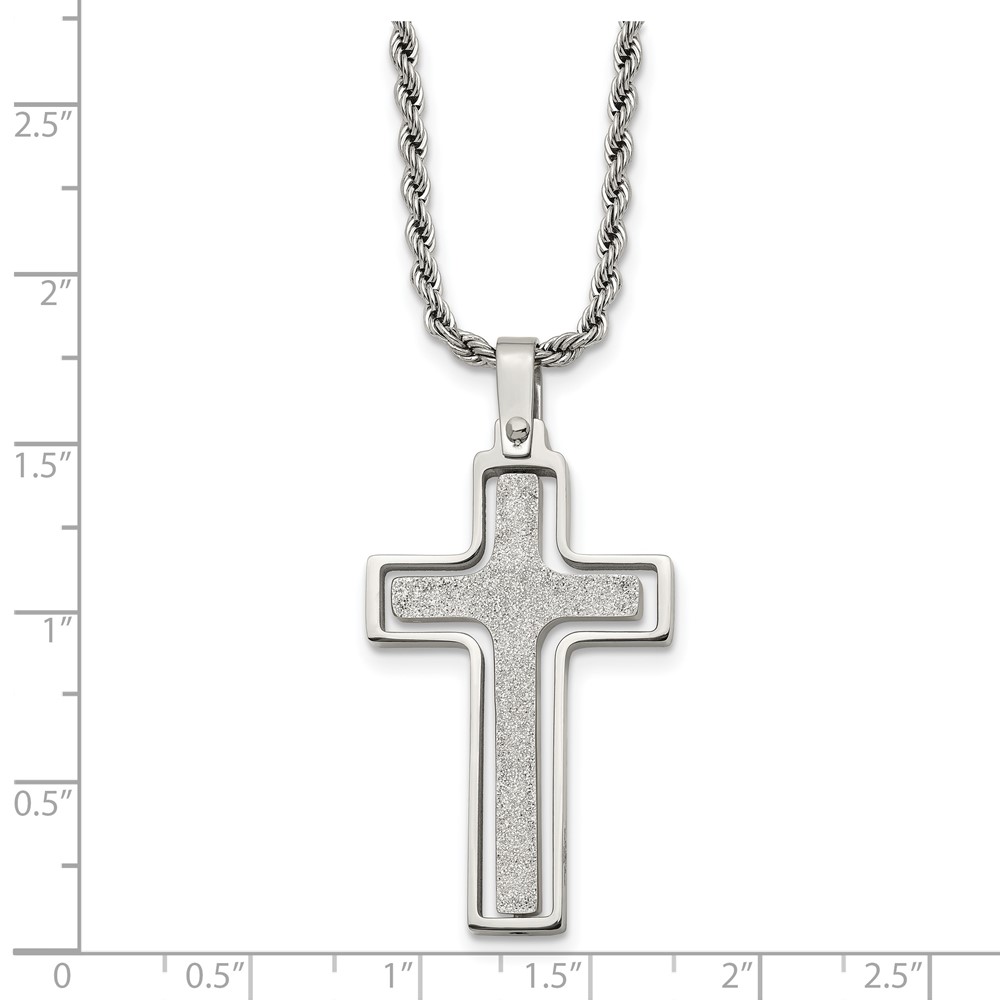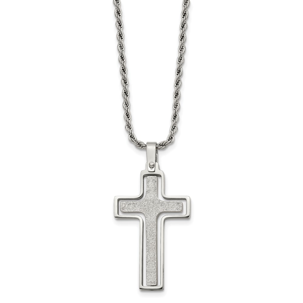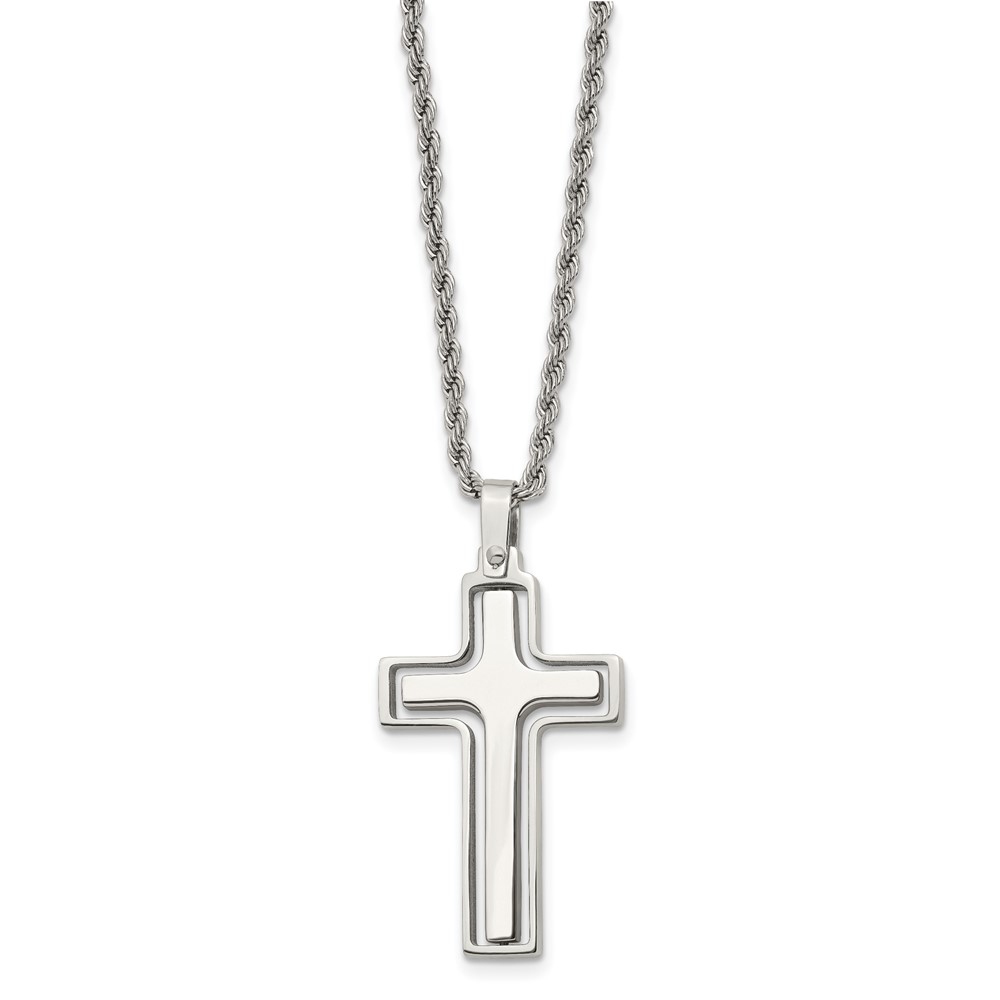Chisel Stainless Steel Polished and Laser Cut Moveable Cross Pendant on a 22 inch Rope Chain Necklace