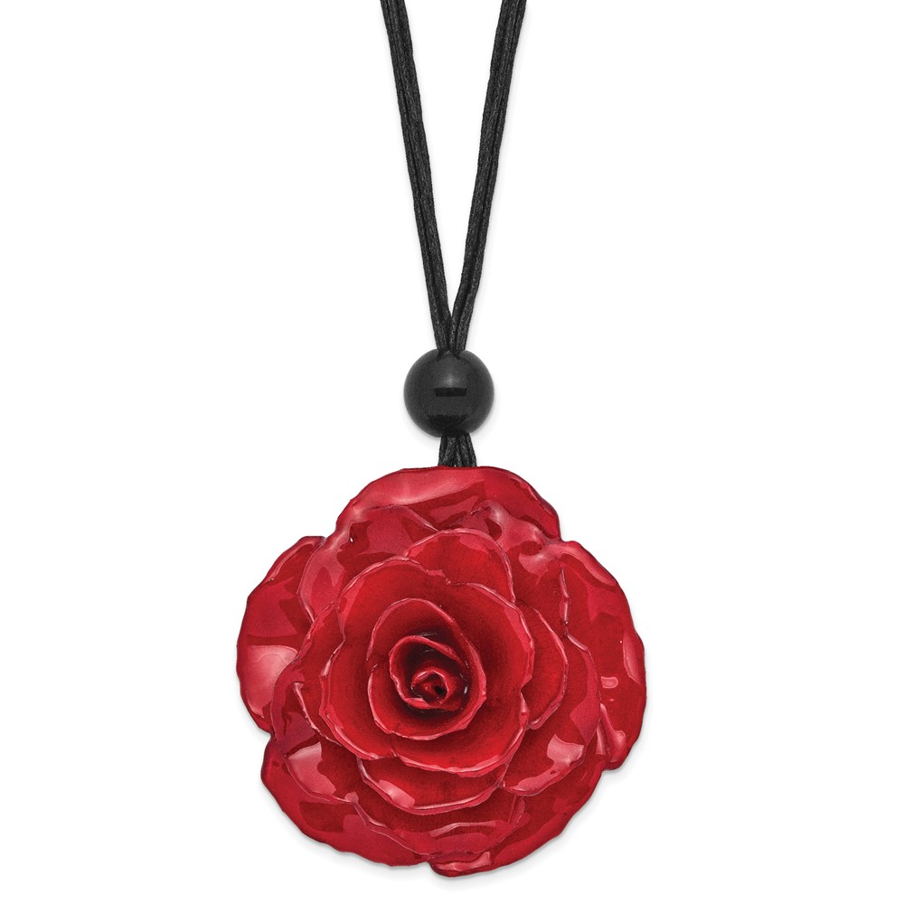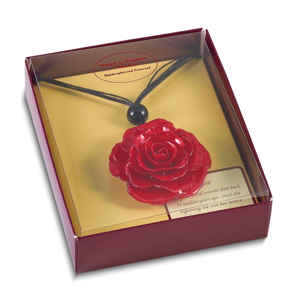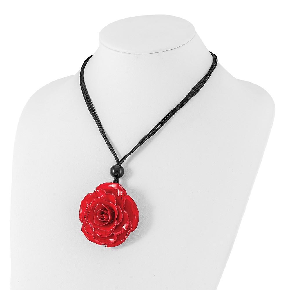 Lacquer Dipped Large Red Real Rose with Glass Bead on 18 inch Black Cotton Cord Necklace