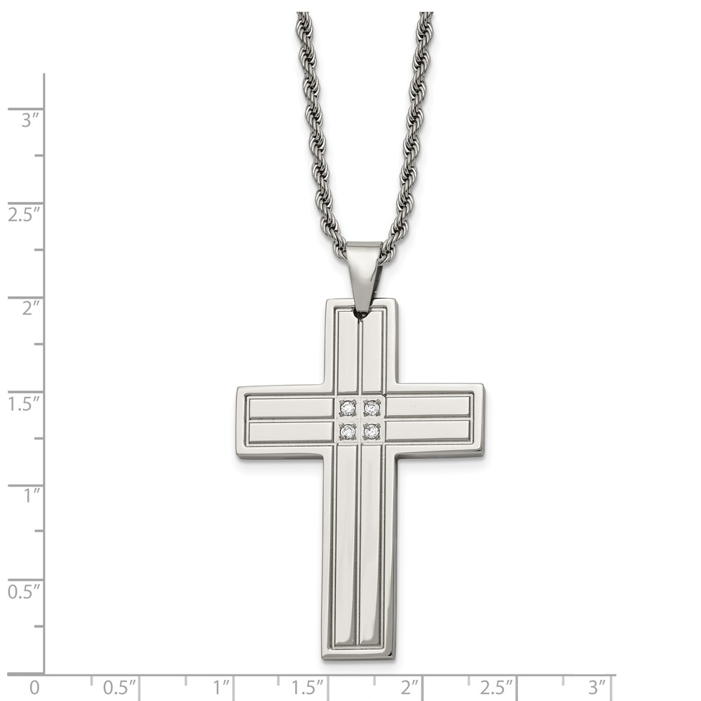 Chisel Stainless Steel Polished with CZ Grooved Cross Pendant on a 24 inch Rope Chain Necklace
