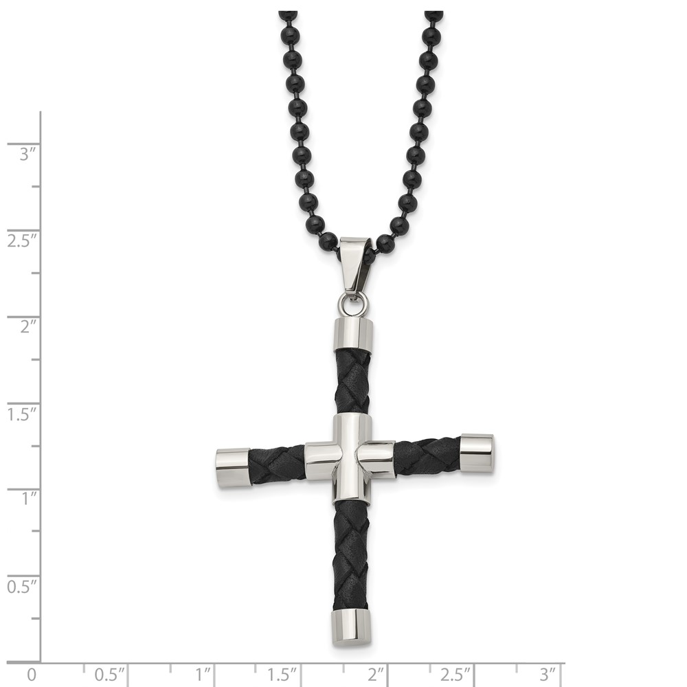 Stainless Steel Polished Black IP w/Black Leather Cross 24in Necklace