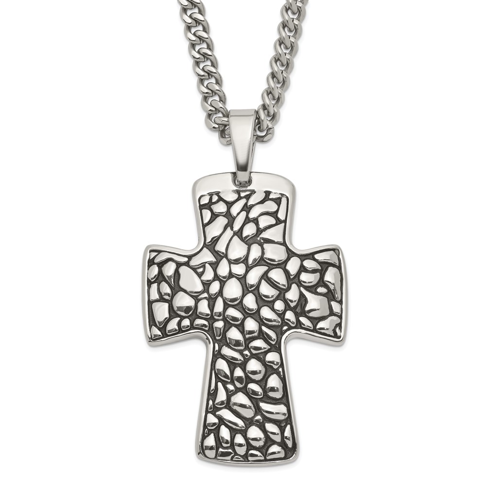 Stainless Steel Black Enamel Pebble Textured Cross Pendant Necklace