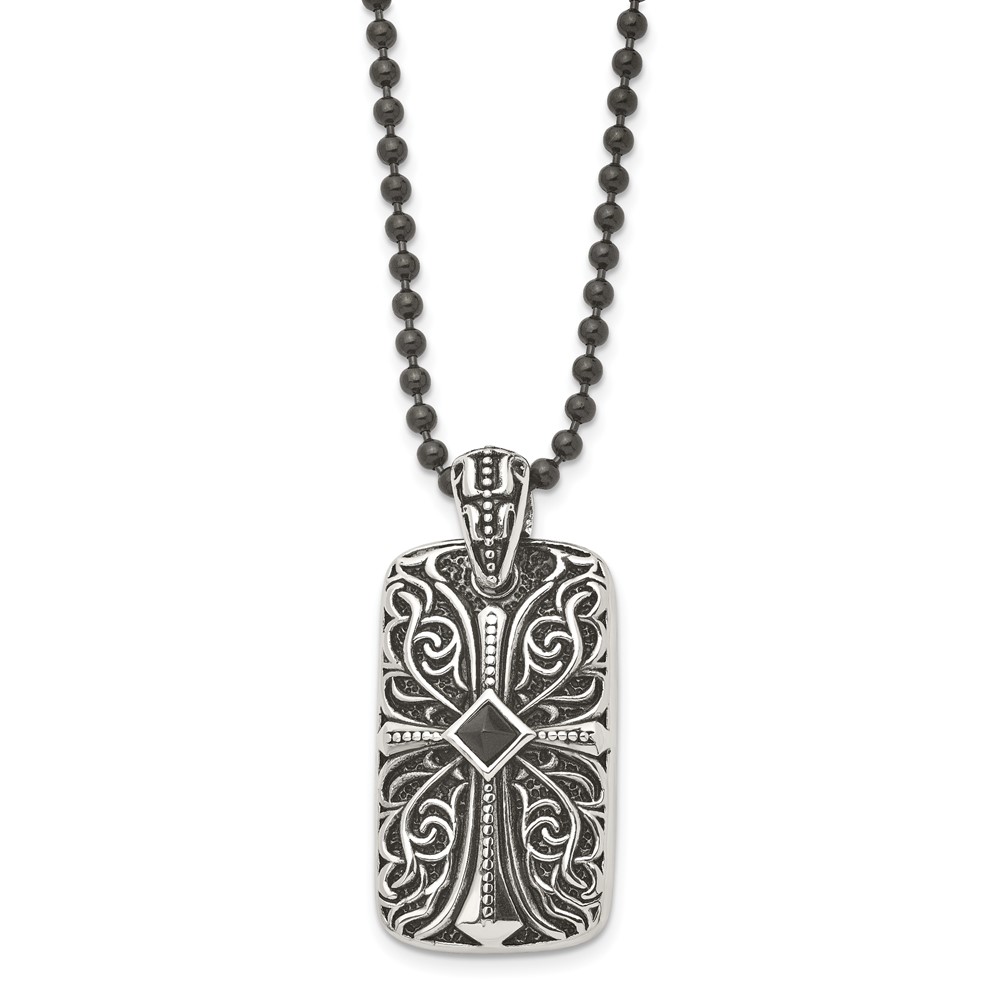 Stainless Steel Antiqued and Polished w/Black Agate Cross DogTag 30in Neckl