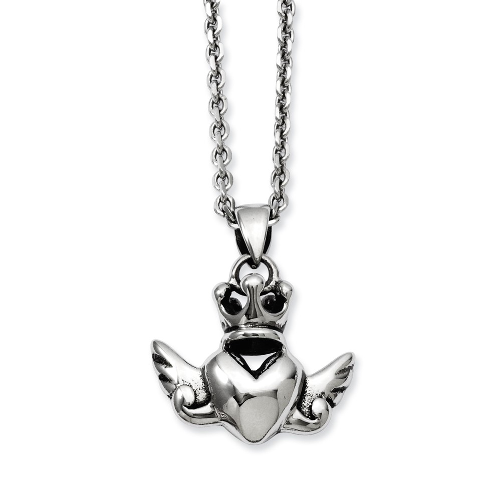Stainless Steel Heart with Crown & Wings 20in w/ext Necklace