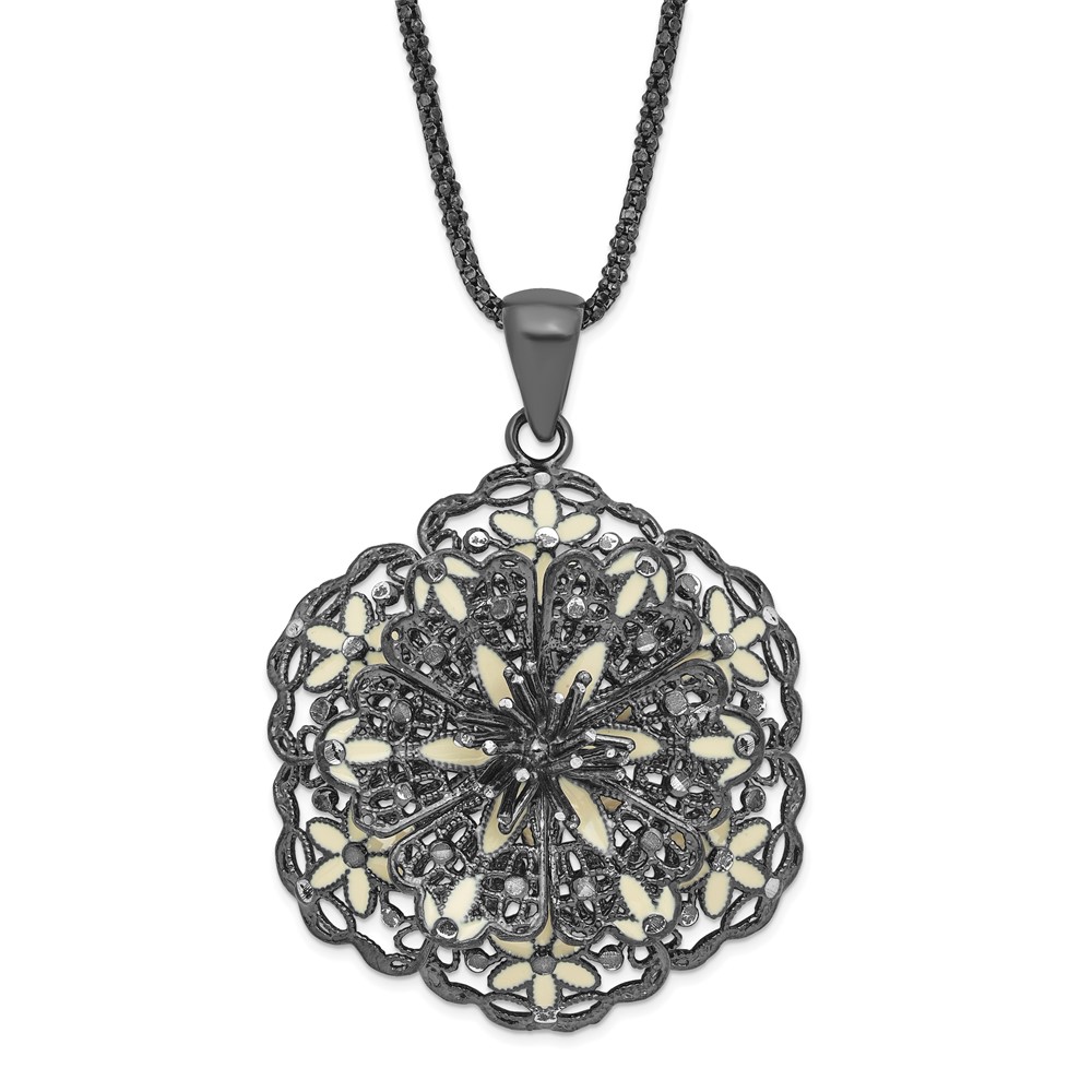 Sterling Silver Black-plated Polished Enameled Vintage Lace Flower Necklace