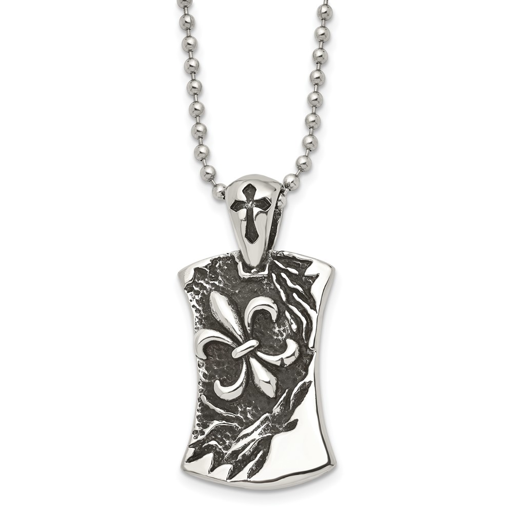 Chisel Stainless Steel Antiqued and Polished Fleur de lis Dog Tag on a 22 inch Ball Chain Necklace
