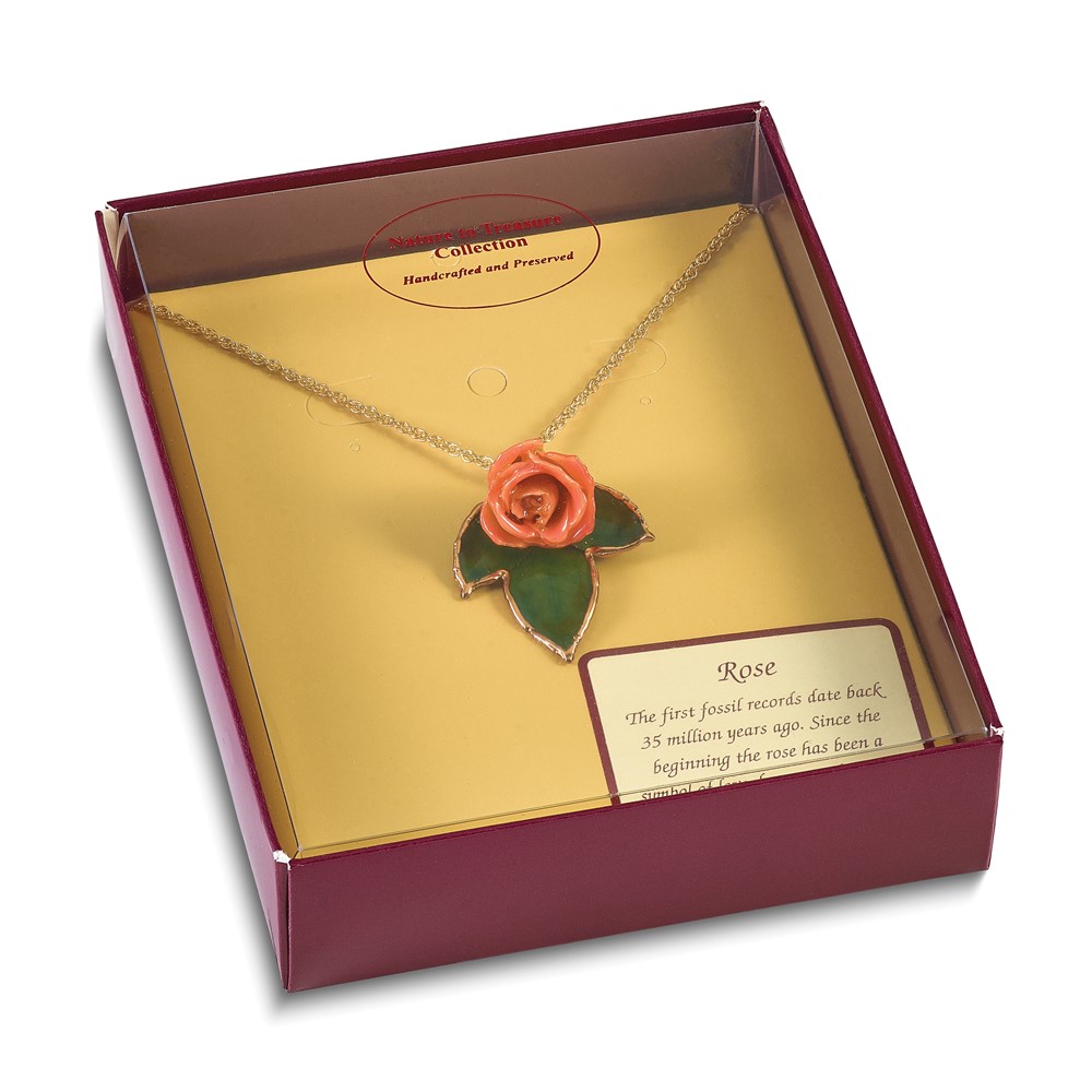 Lacquer Dipped Cream and Pink Real Rose on 24K Gold-trim Lacquered Dipped Leaf 20 inch Gold-tone Necklace
