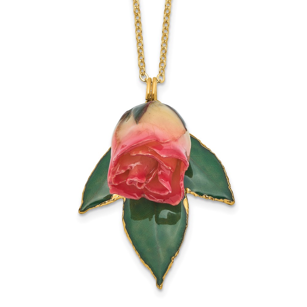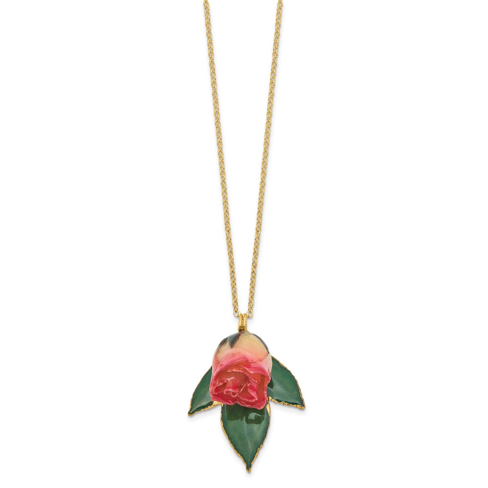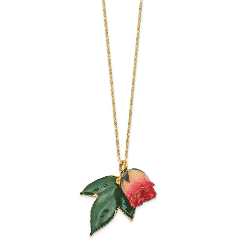Lacquer Dipped White and Pink Real Rosebud on 24K Gold-trim Lacquered Dipped Leaf 20 inch Gold-tone Necklace
