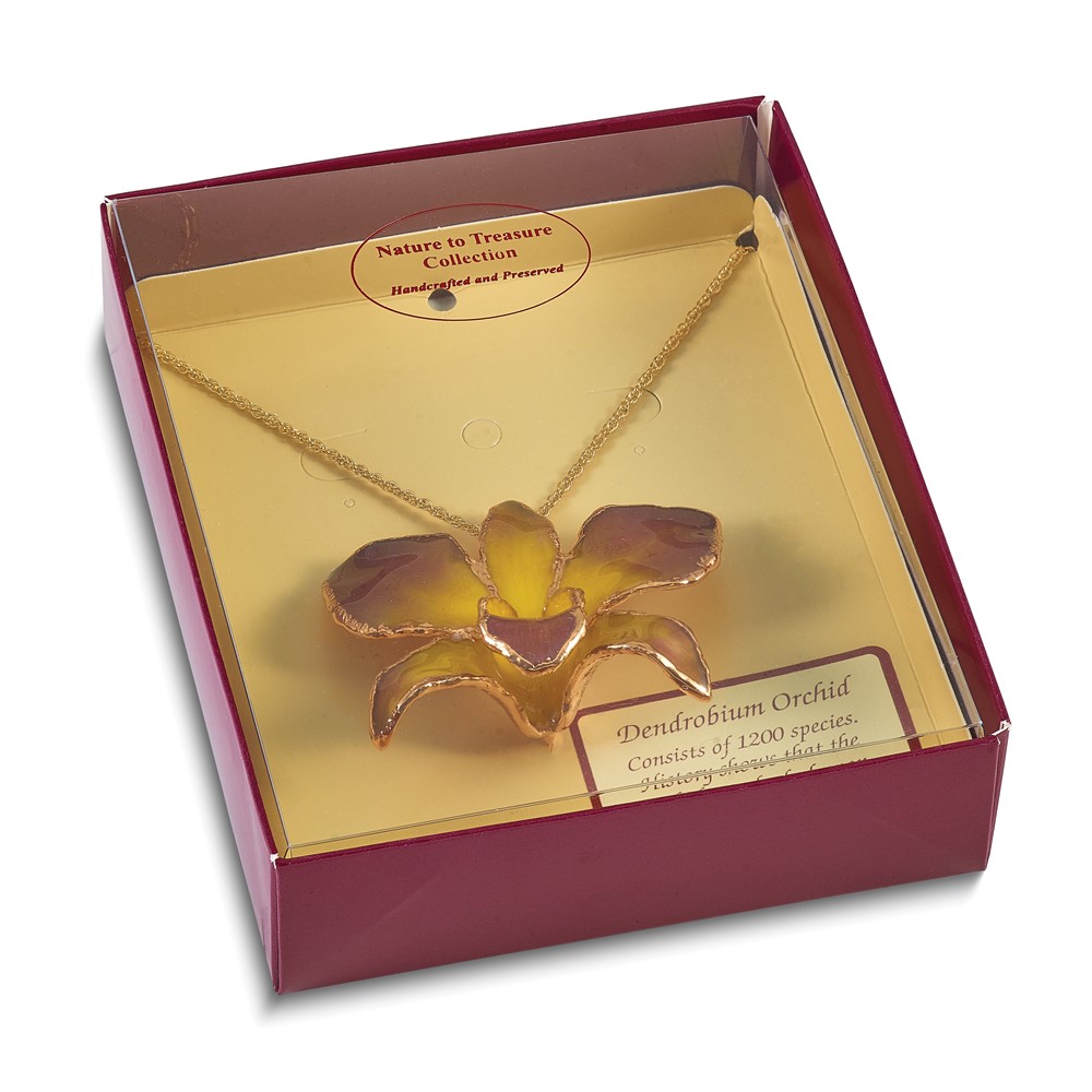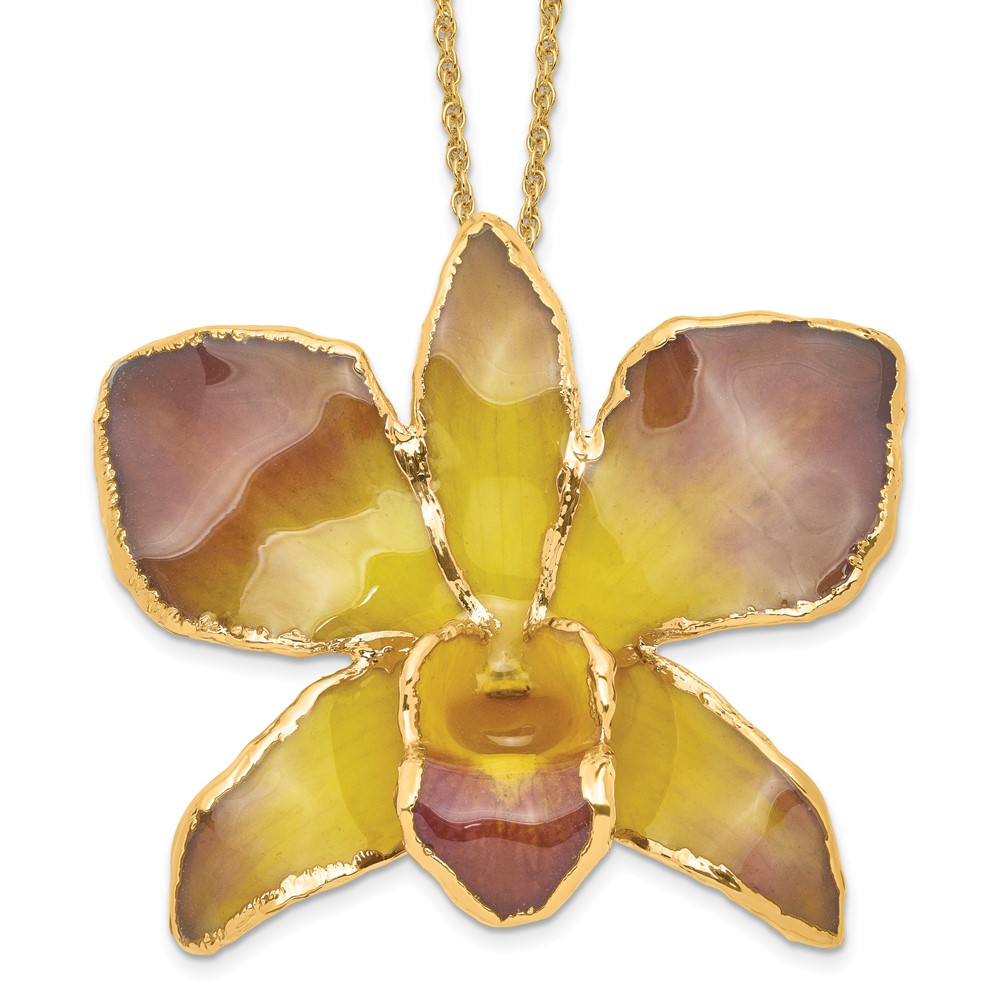 24K Gold-trim Lacquer Dipped Purple and Yellow Real Dendrobium Orchid 20 inch Gold-tone Necklace