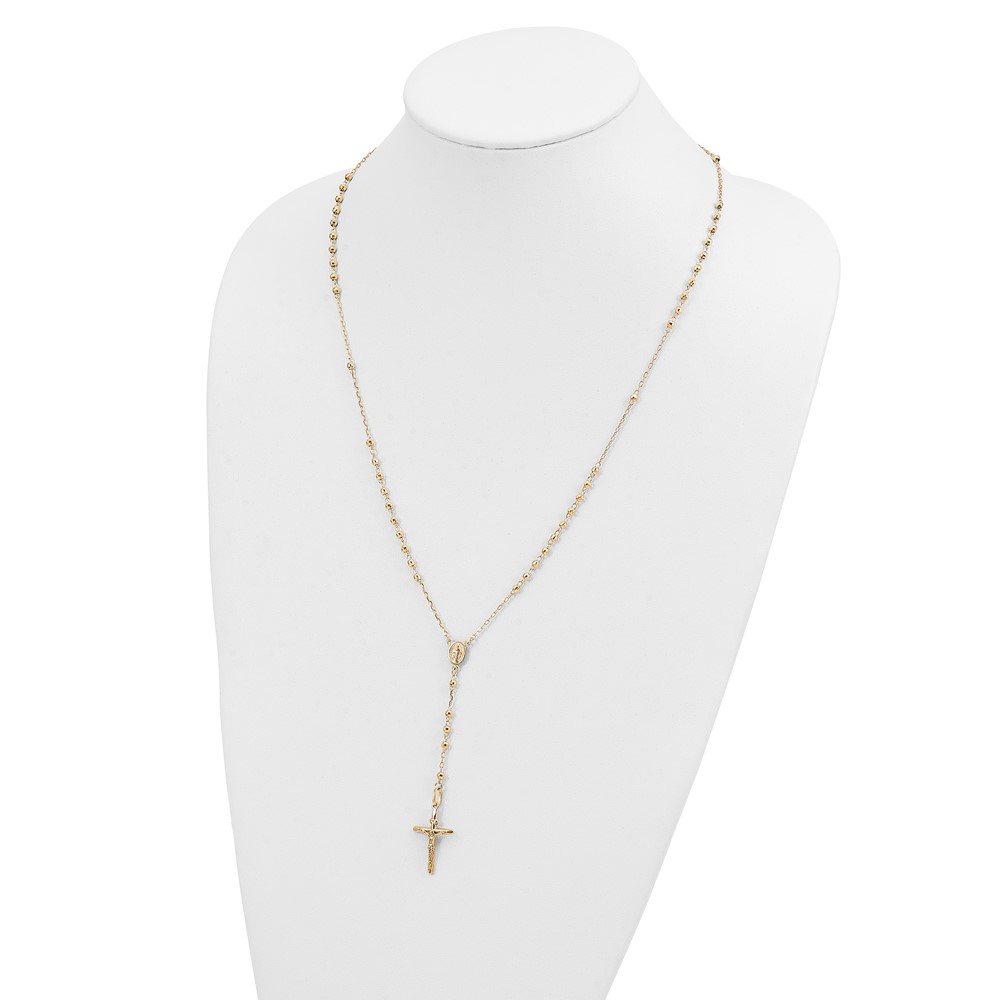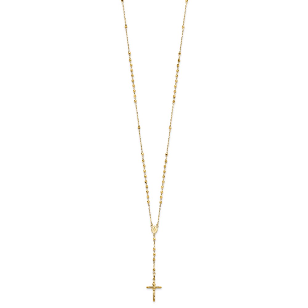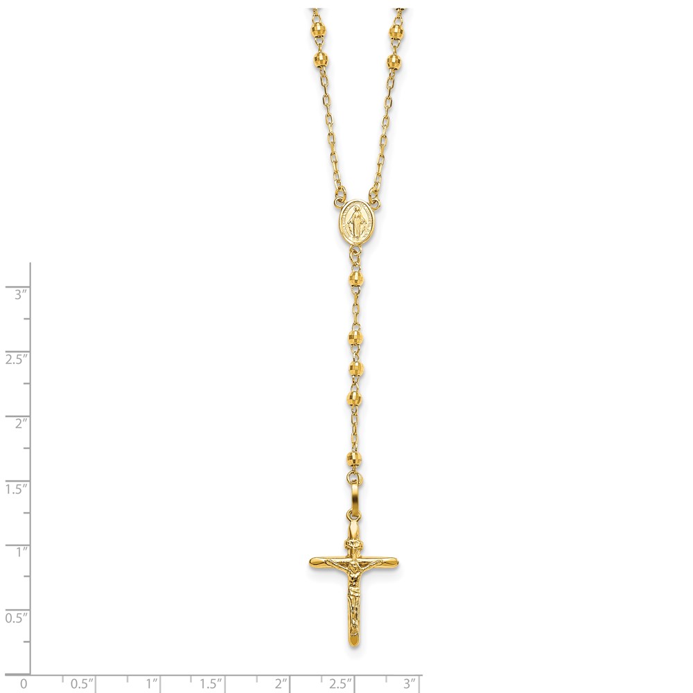 14k Polished Crucifix and Miraculous Medal with 3mm Mirror Beads Semi-solid 24 inch Rosary Necklace