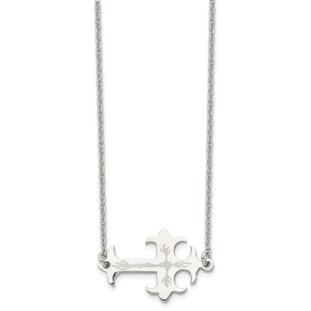 Chisel Stainless Steel Brushed and Polished Flame Design Sideways Cross on a 21 inch Cable Chain Necklace