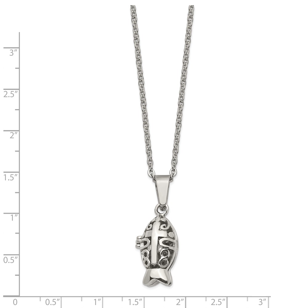 Chisel Stainless Steel Polished and Antiqued Magnetic Fish Prayer Box on an 18 inch Cable Chain Necklace