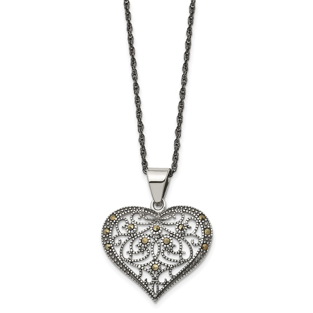 Chisel Stainless Steel Antiqued and Polished with Marcasite Heart Pendant on a 20 inch Singapore Chain Necklace