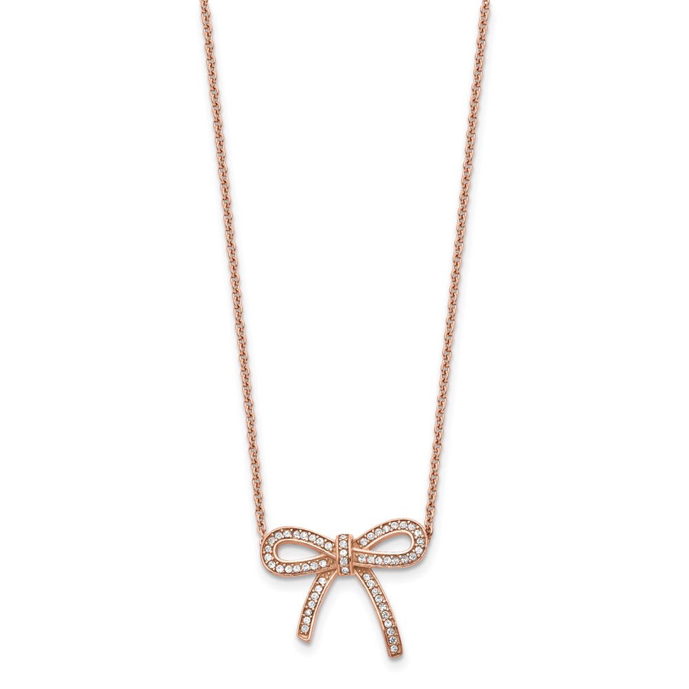 Stainless Steel Polished Rose IP-plated Crystal Bow w/1.75in ext Necklace