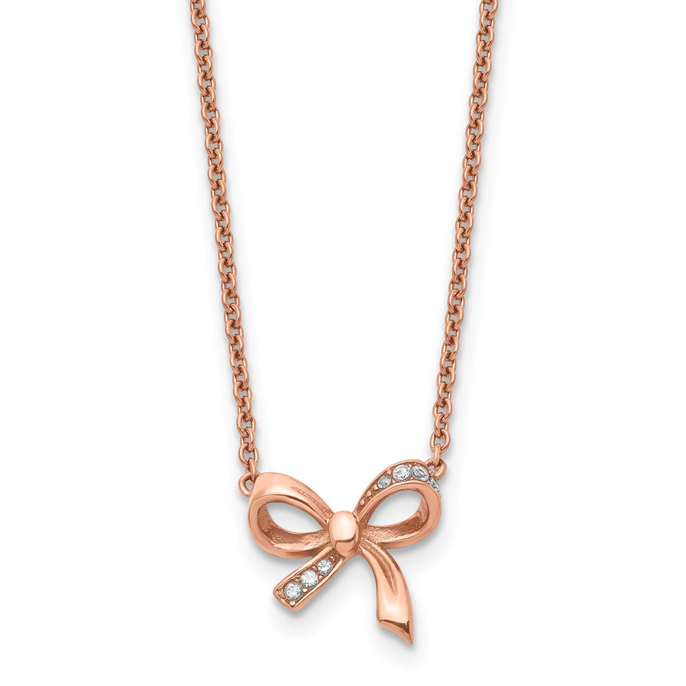 Stainless Steel Polished Rose IP-plated w/CZ Bow w/1.75in ext Necklace