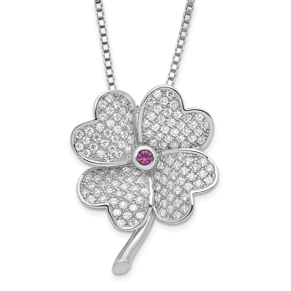 Sterling Silver Rhodium CZ & Red Corundum Four Leaf Clover Necklace