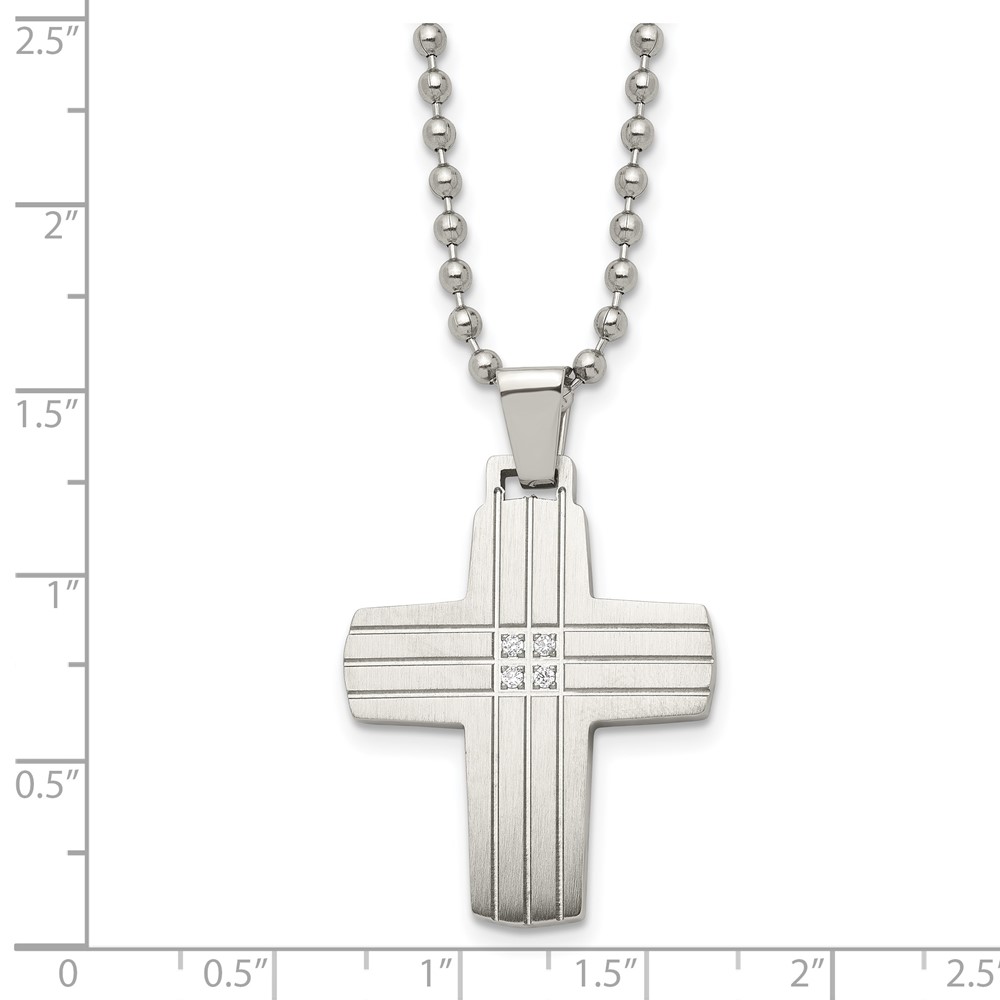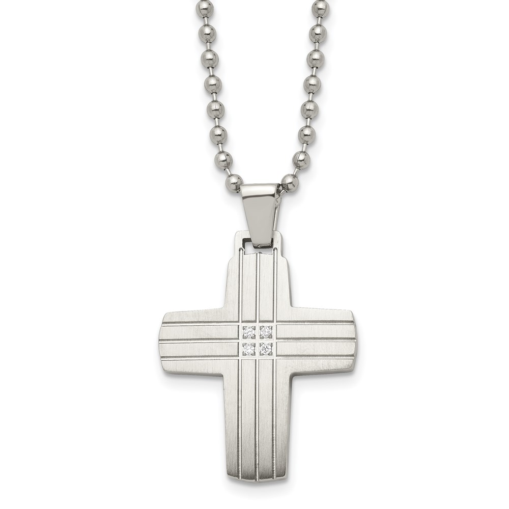 Chisel Stainless Steel Brushed and Polished with CZ Grooved Cross Pendant on a 22 inch Ball Chain Necklace