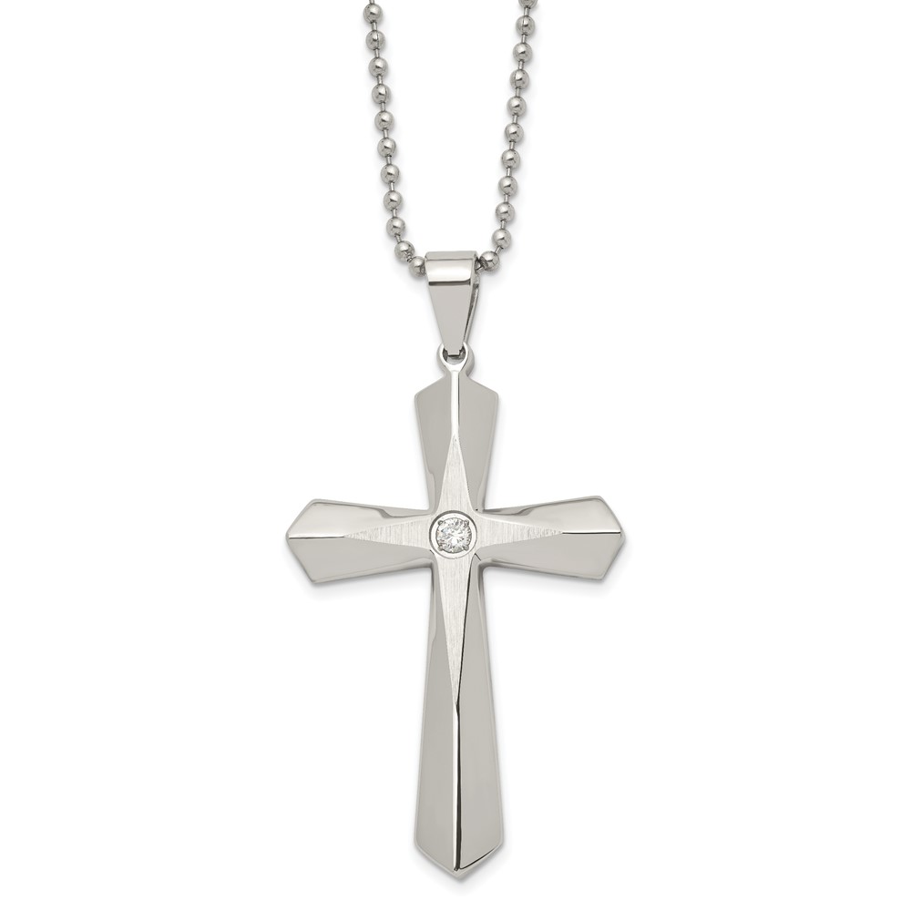Chisel Stainless Steel Brushed and Polished with CZ Cross Pendant on a 24 inch Ball Chain Necklace
