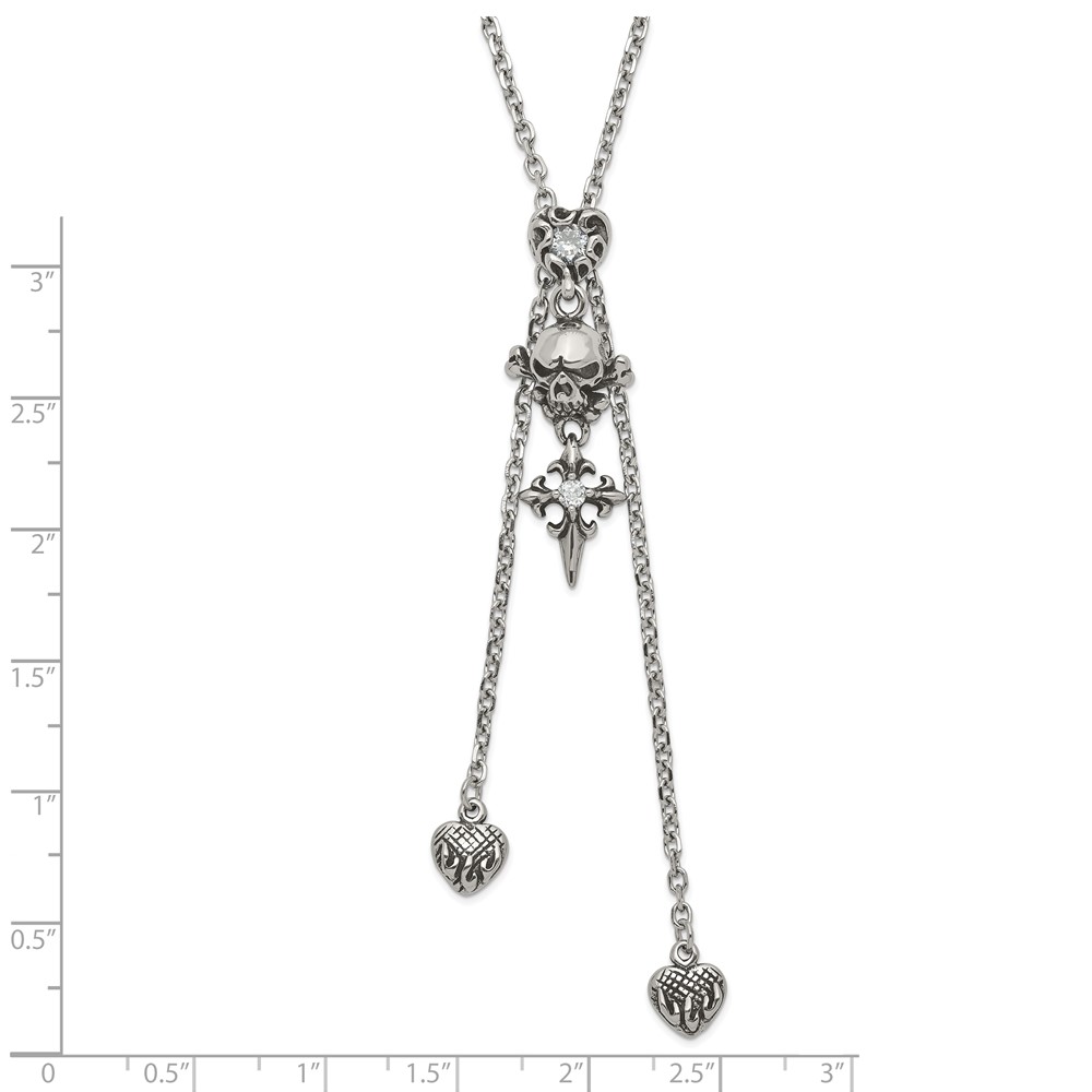 Stainless Steel Antiqued & Polished CZ Heart Skull & Cross Adjustable Necklace