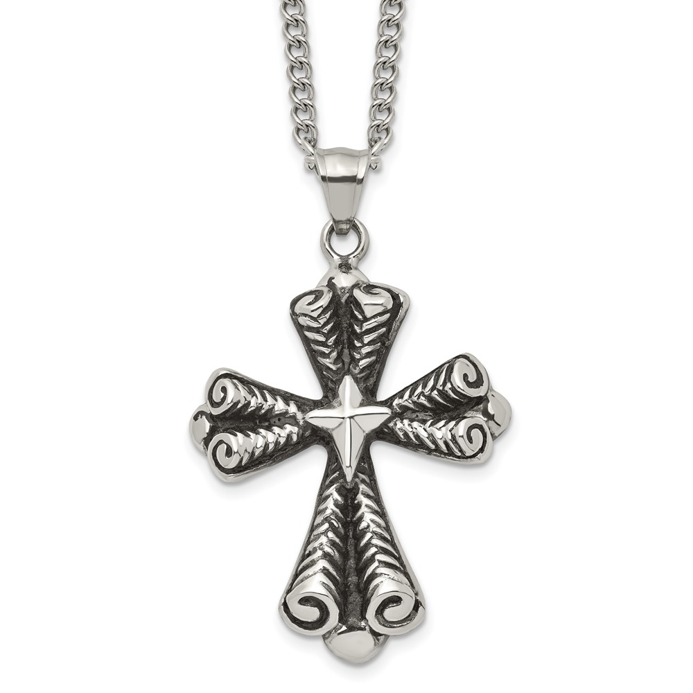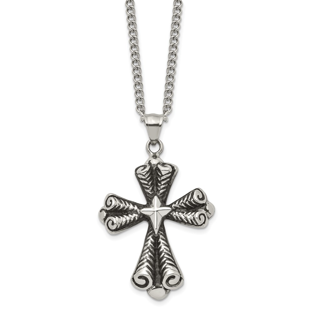 Stainless Steel Antiqued Polished and Textured Cross 24in Necklace