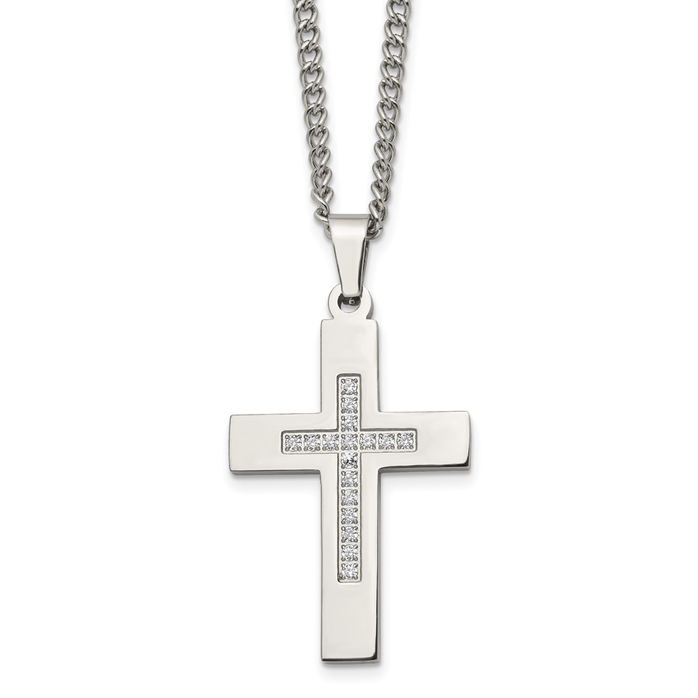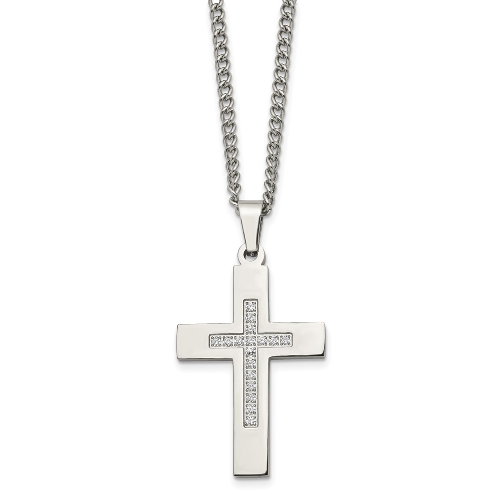 Chisel Stainless Steel Polished with CZ Cross Pendant on a 24 inch Cable Chain Necklace