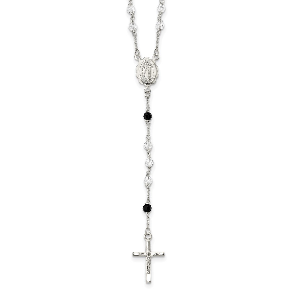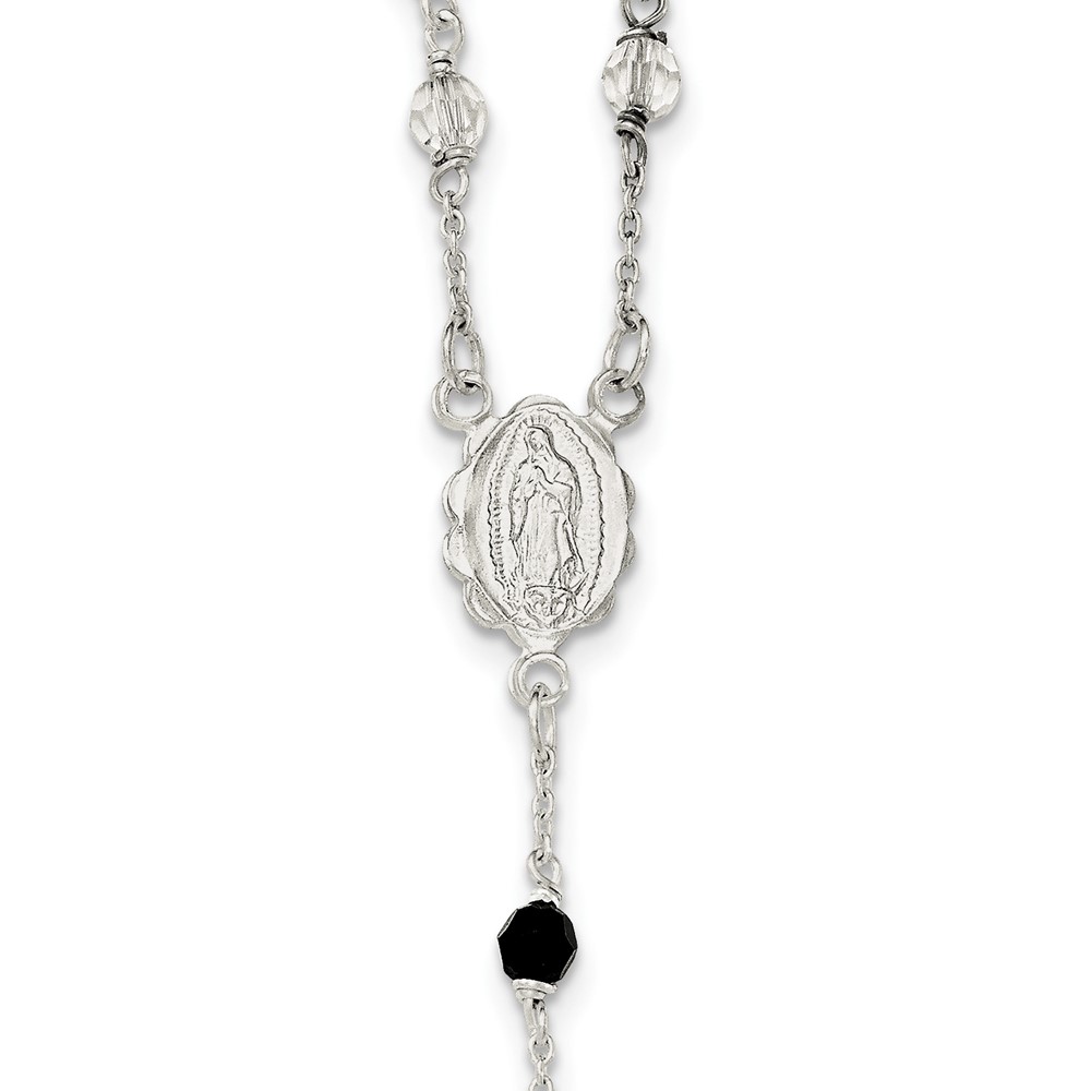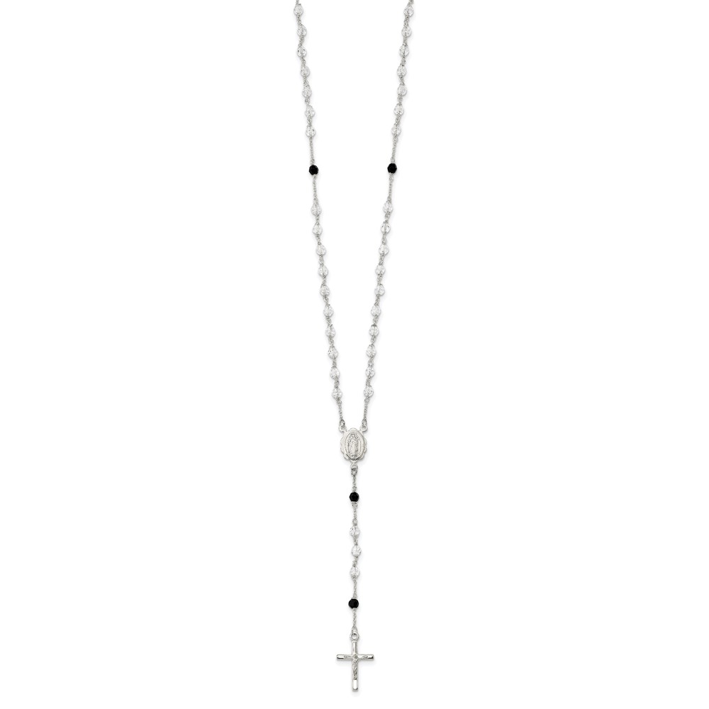 Sterling Silver Polished and Black Crystal Bead Rosary 23.5 inch Necklace