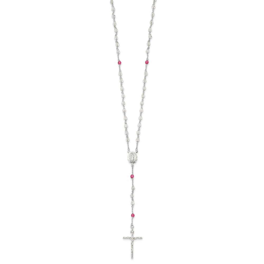 Sterling Silver Polished Crystal Rose Quartz Rosary Necklace