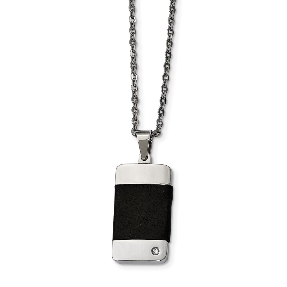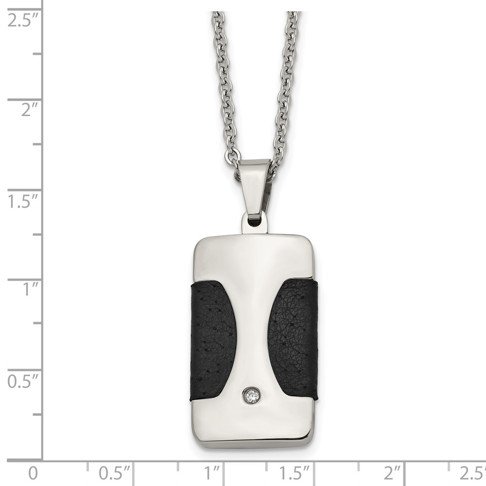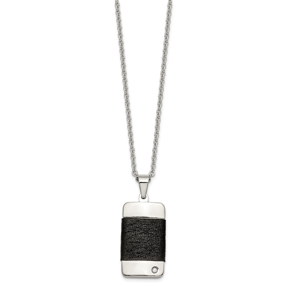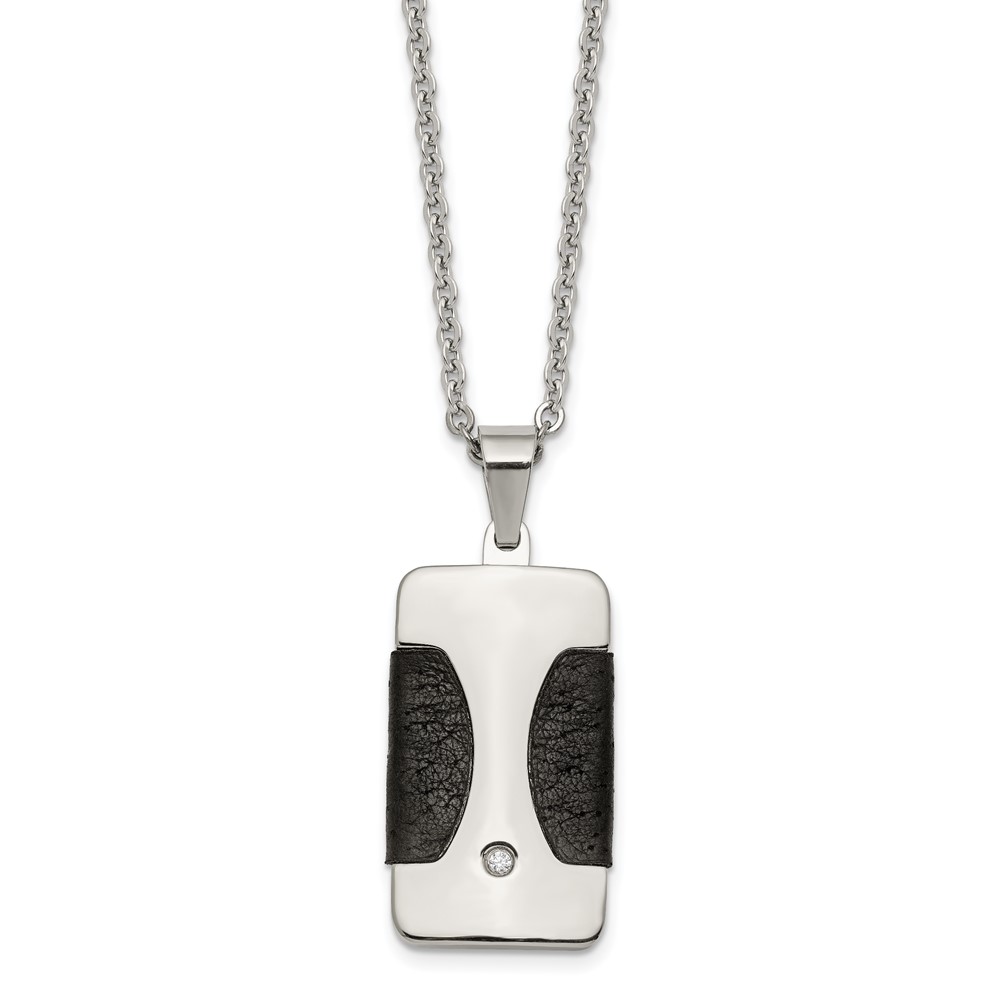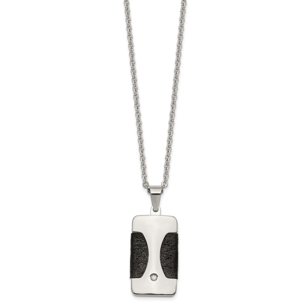 Stainless Steel Polished w/ CZ & Leather Reversible Inlay 22in Necklace