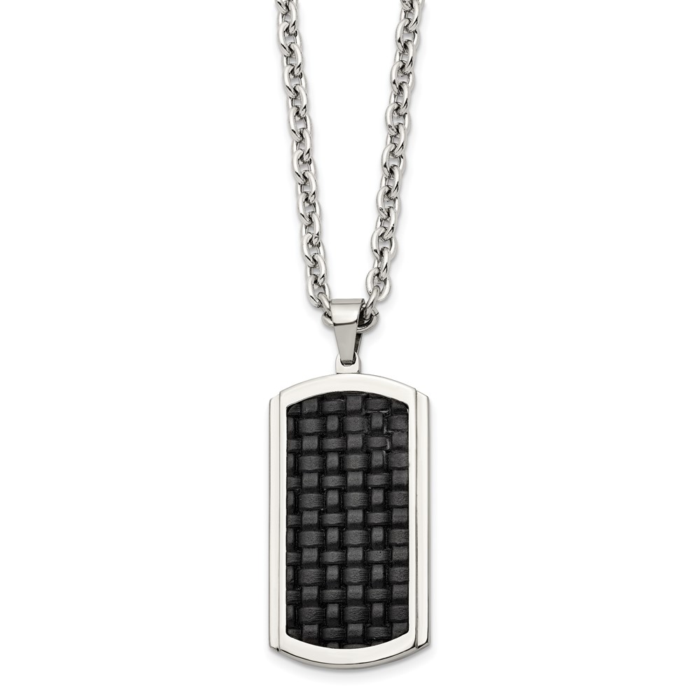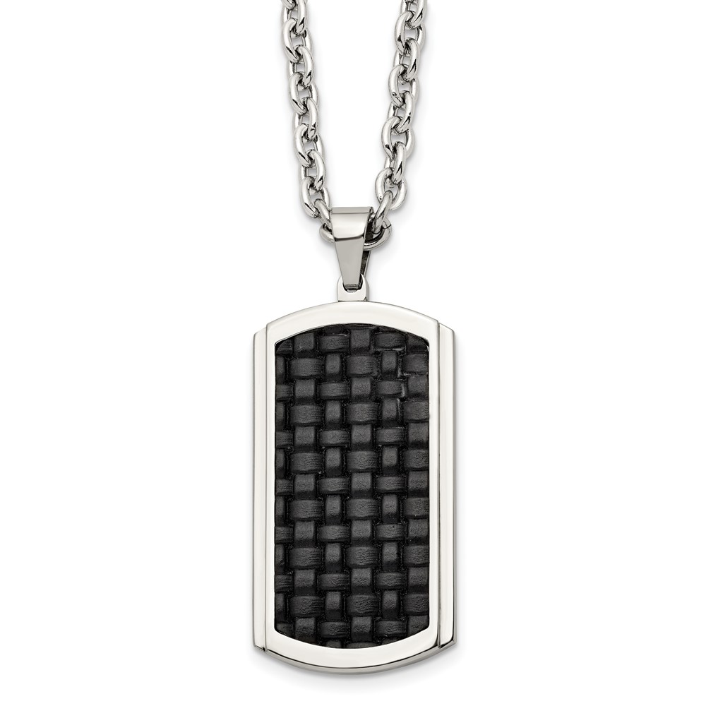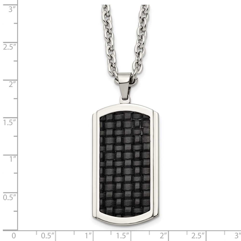 Stainless Steel Polished & Textured Leather Inlay Dog Tag 24in Necklace