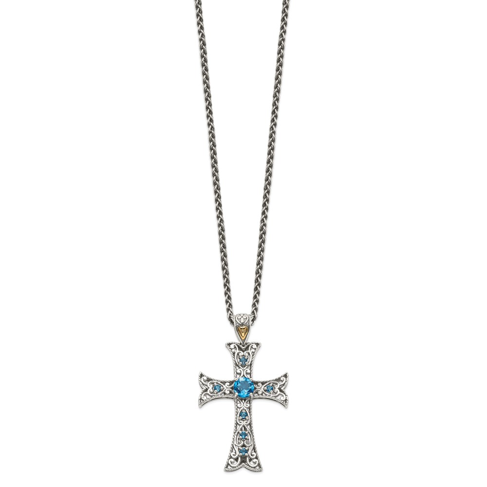 Shey Couture Sterling Silver with 14K Accent 18 Inch Antiqued Round London Blue Topaz Cross Necklace