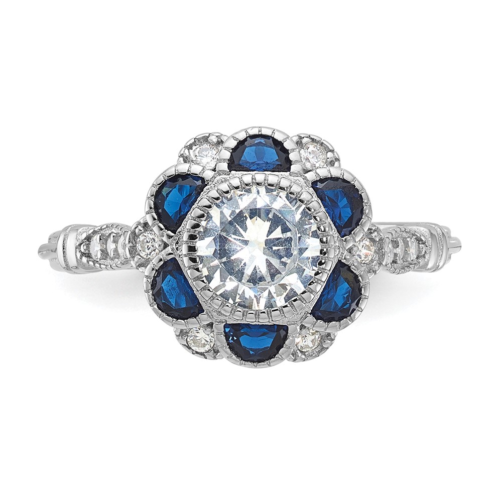 Sterling Silver Rhodium-plated CZ and Lab Cr. Blue Sapphire Flower Ring