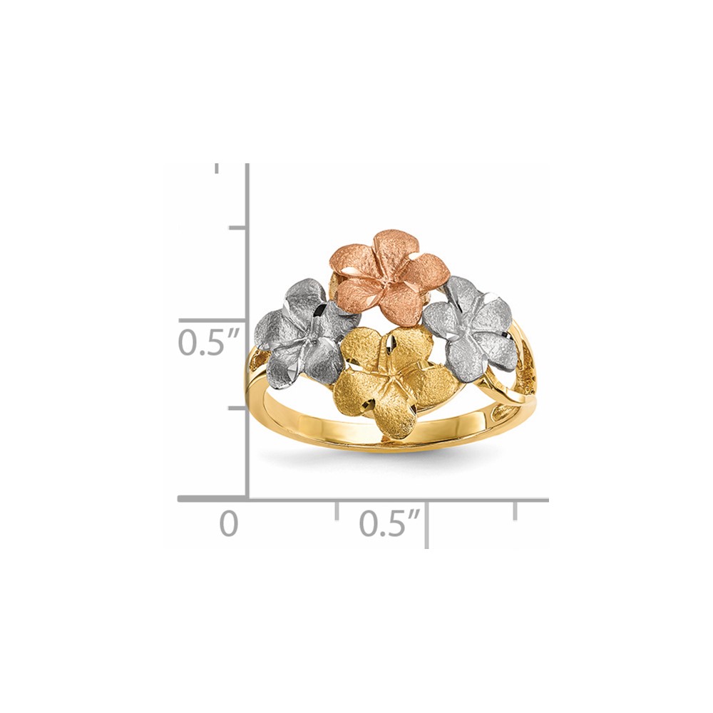 14k Two-tone with White Rhodium Polished and Satin Diamond-cut 4-Plumeria Flowers Ring