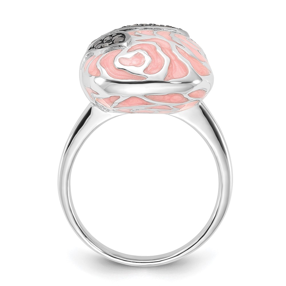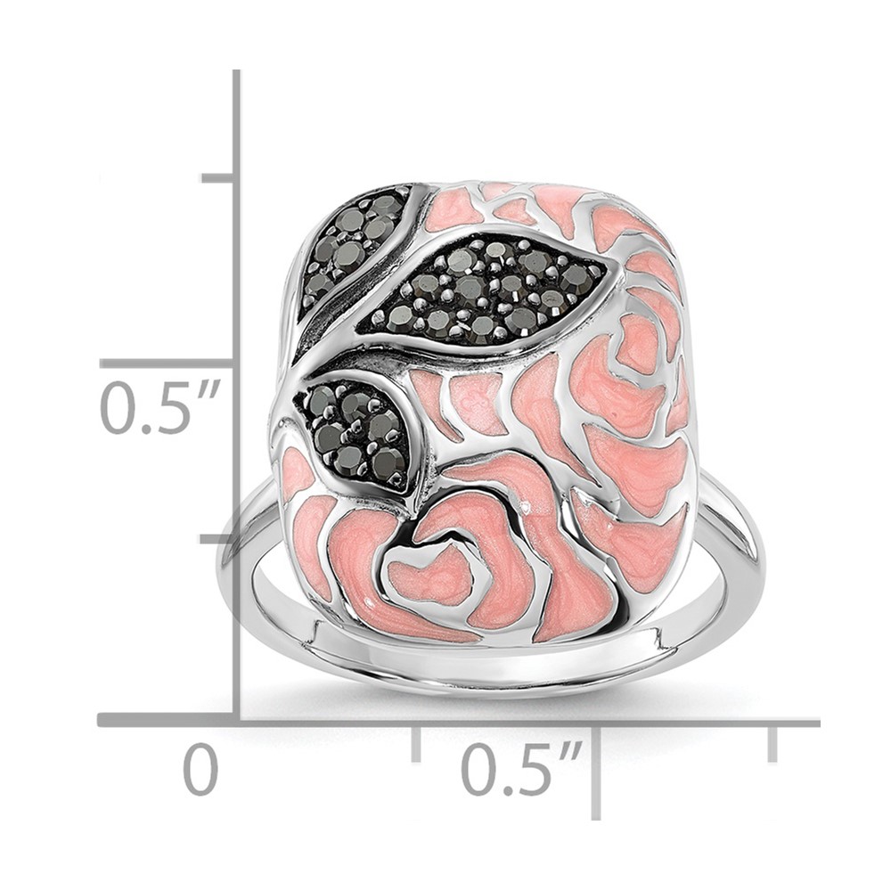Sterling Silver Polished Pink Enamel & Black CZ Floral Design Ring