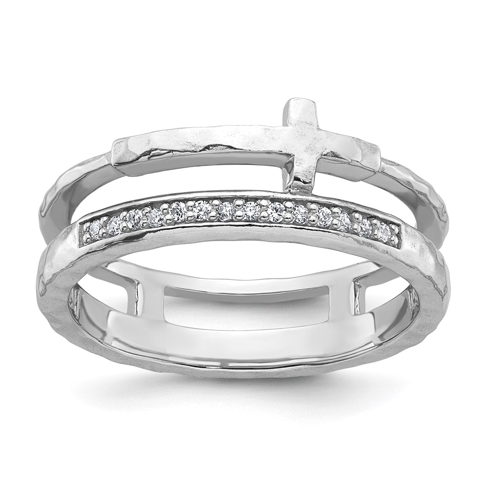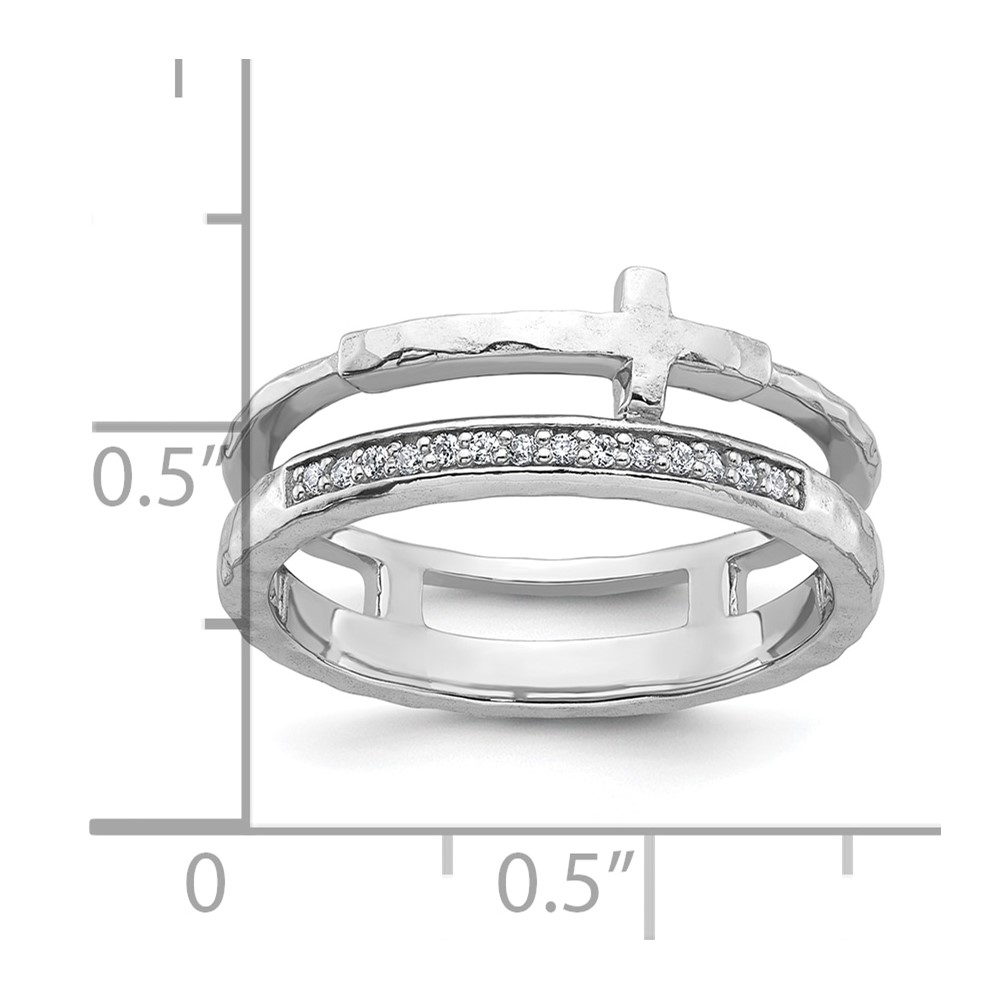 Sterling Silver Rhodium-plated Polished CZ and Hammered Cross Double Band Size 6 Ring