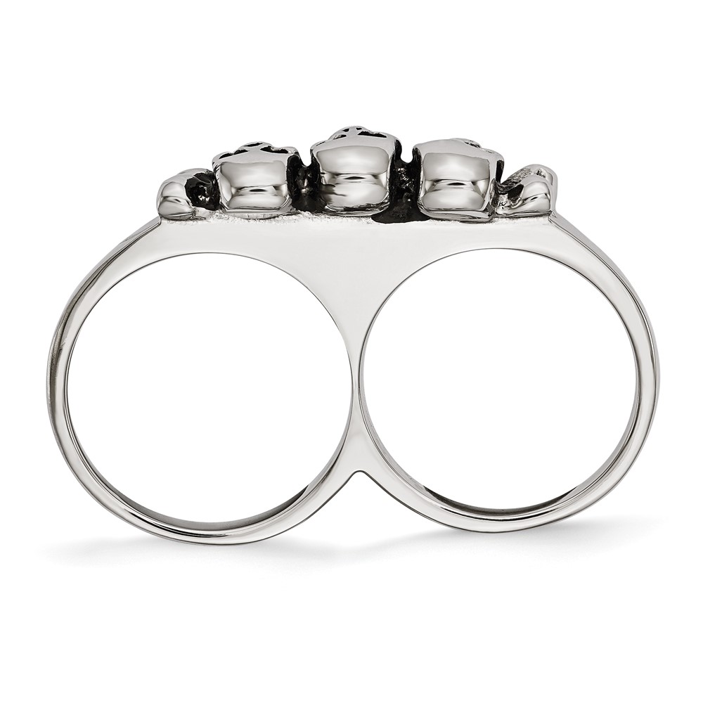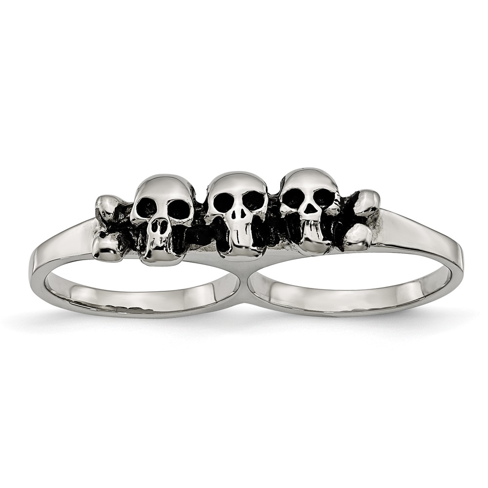Stainless Steel Polished & Antiqued Two Finger Skulls Ring