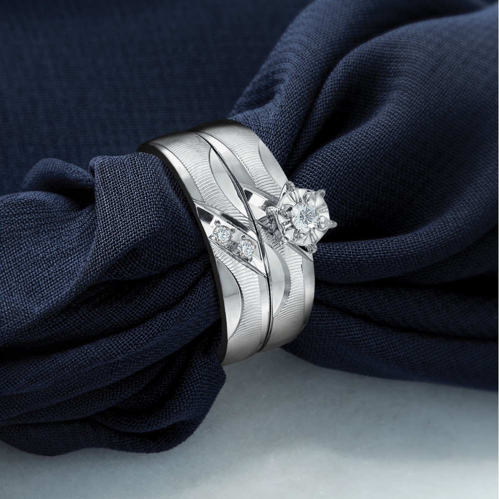 14k White Gold AA Quality .02 carat Diamond Trio Ladies Complete Wedding Band