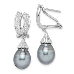 Sterling Silver Rhd-plt 9-10mm Tahitian Drop Pearl CZ Omega Back Earrings