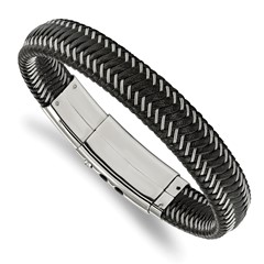 Stainless Steel Polished Black Leather with Wire Adjust 8in to 8.5in Bracelet
