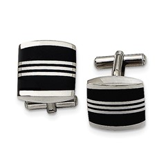 Stainless Steel Polished Grooved Black Rubber Stripes Cufflinks